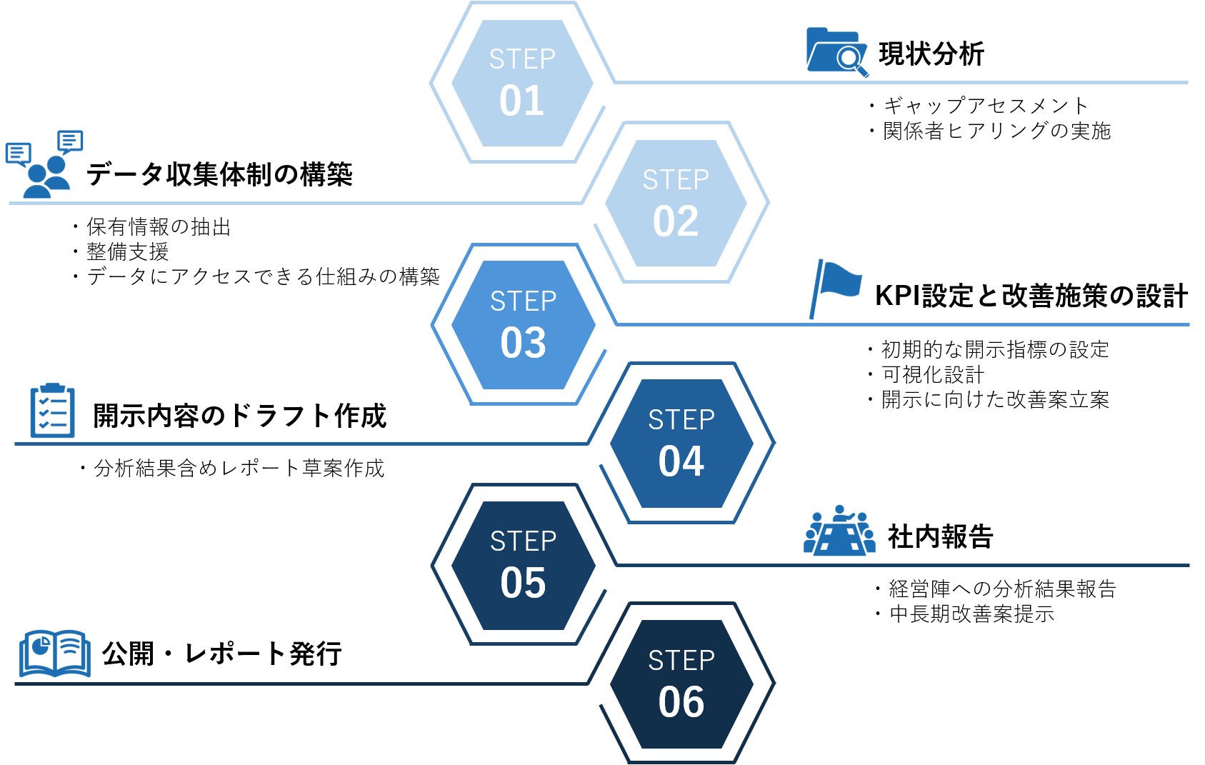 - 支援内容によりますが、実際に社内にISO30414のデータ収集の仕組みを確立させ、運用につなげるにはおおよそ1年必要です。